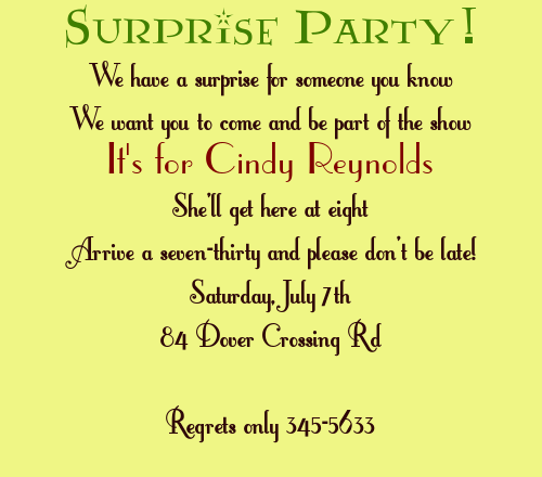 [37 Lumos.ttf 64,127,0]Surprise Party! We have a surprise for someone you know We want you to come and be part of the show [30 VpsHobit.ttf 128,0,0]It's for Cindy Reynolds She'll get here at eight Arrive a seven-thirty and please don't be late! Saturday, July 7th 84 Dover Crossing Rd Regrets only 345-5633